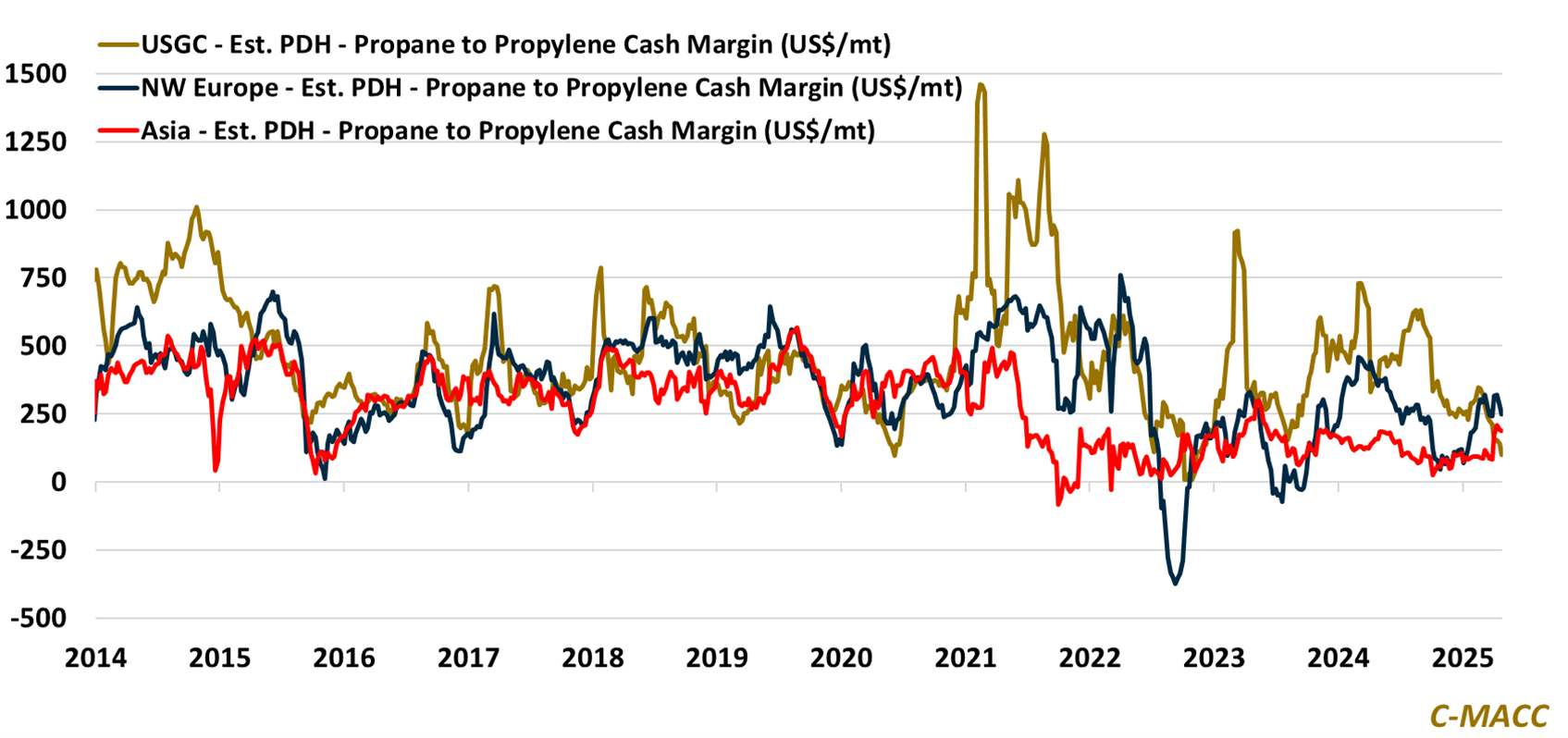 Exhibit 1 – Chart of the Day: USGC PDH margins fall to a YTD low in absolute terms and relative to Asia and Europe.