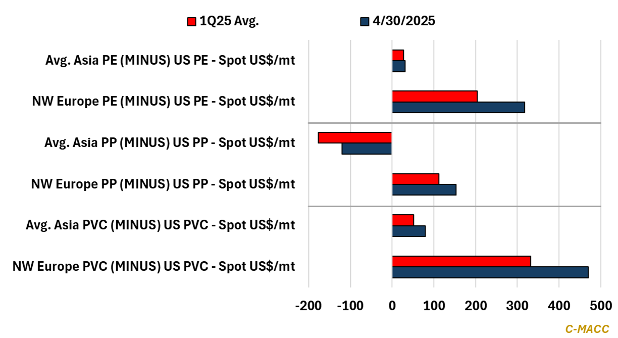 Exhibit 1 – Chart of the Day: US spot PE, PVC, and PP have fallen from their 1Q25 average relative to Europe and Asia.