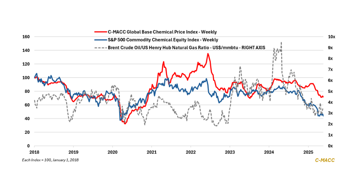 General Thoughts: Global spot commodity chemical prices have declined year-to-date as the production cost curve flattened. Despite a mixed setting last week, most prices will