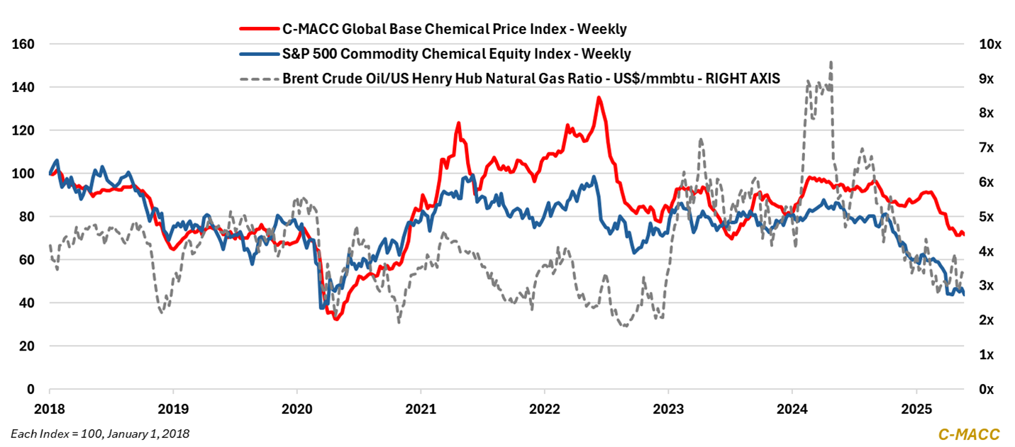 Exhibit 1 – Chart of the Day: Global base chemical spot prices and US commodity chemical equities reflect YTD lows.
