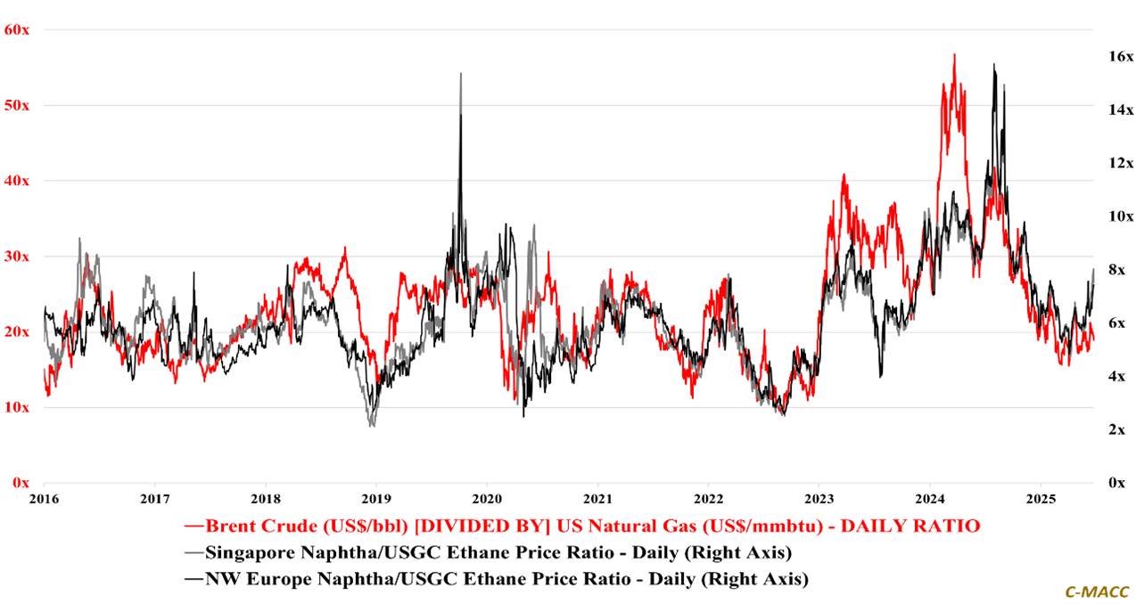 - Other Sector Developments: Ex-US naphtha prices reflect more support relative to USGC ethane compared to the crude oil prices relative to US natural gas, which is positive for North American polymer producer margins.