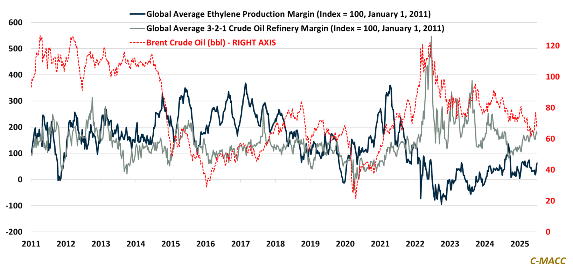 • General Thoughts: Global refining margins have risen YTD on tight product balances, but chemical producers face persistent margin compression as oversupply, weak demand, and policy-driven volatility cloud the 2H25 outlook.