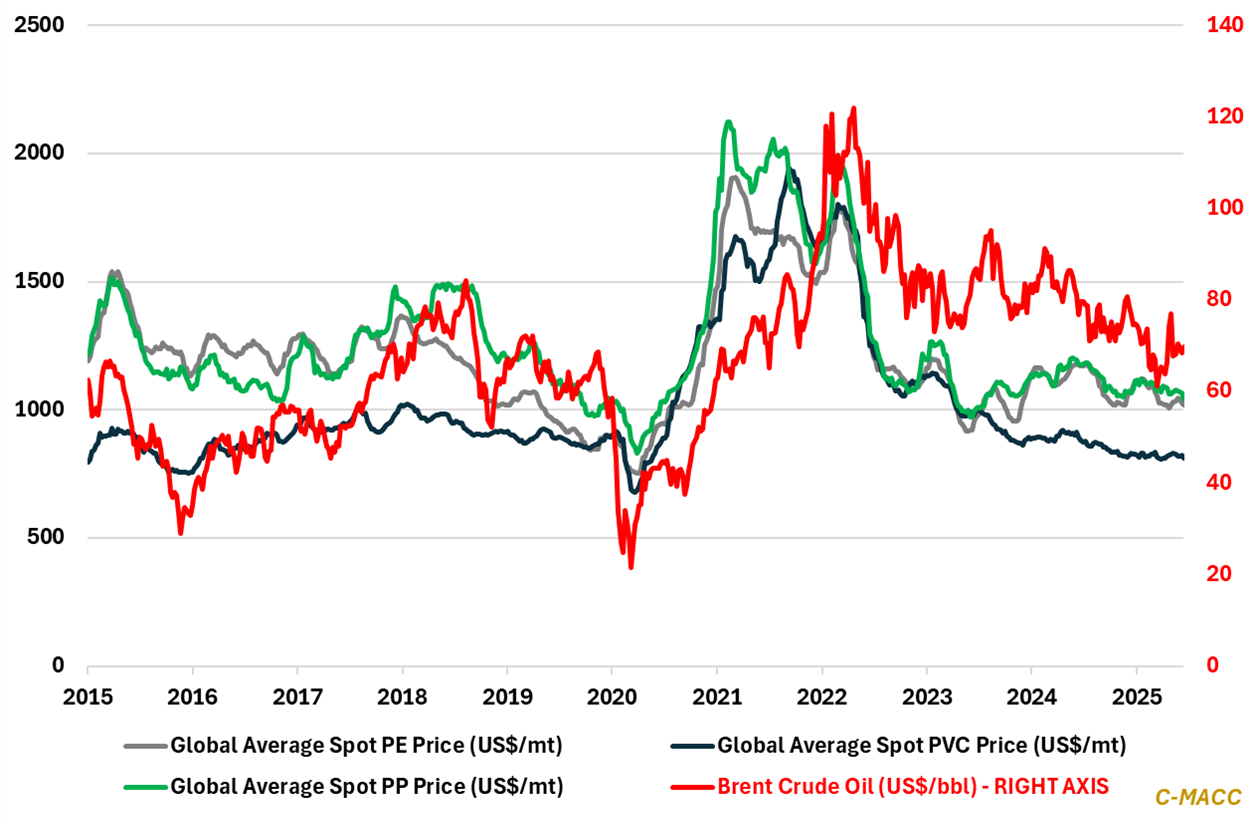 Exhibit 1 – Chart of the Day: Global average spot polymer prices remain near 2025 lows; unlikely to surge in 2H25.