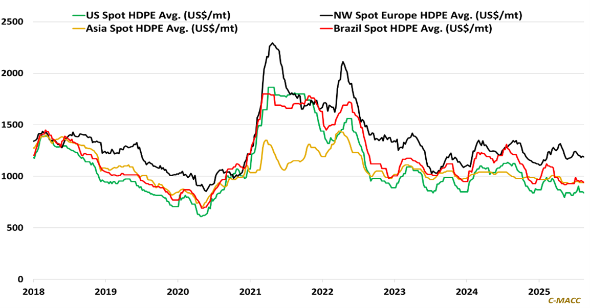 - Polyethylene (PE): Global PE markets remain trapped in an oversupply setting, with generally weak demand, rising protectionist actions, and new capacity limiting upside potential amid likely persistent price pressure into 4Q25.