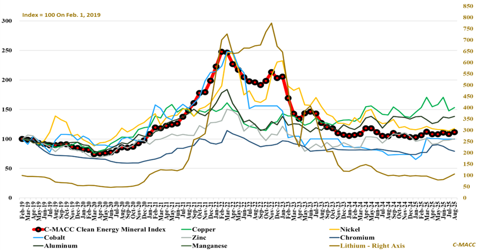 Exhibit 1: The C-MACC clean energy mineral index increased ~3% in August, rising ~9% since the start of 2025.