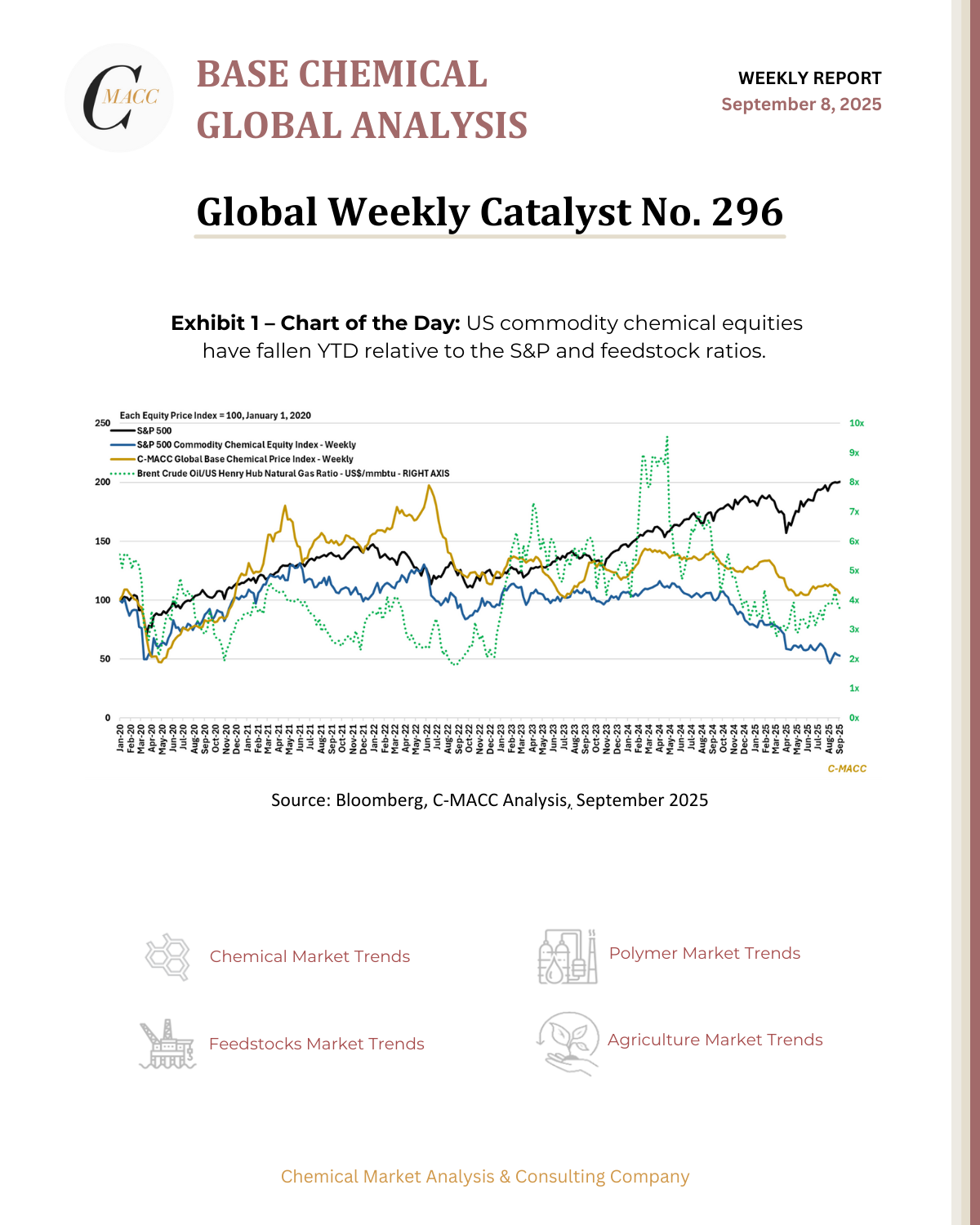 Base Chemical Global Analysis Global Weekly Catalyst No. 296 General Thoughts: Global commodity chemical markets remain margin-compressed, oversupplied, and policy-sensitive, with investors watching for stabilization yet hesitating to pivot toward a 2026 improvement story. September 8, 2025 No Comments