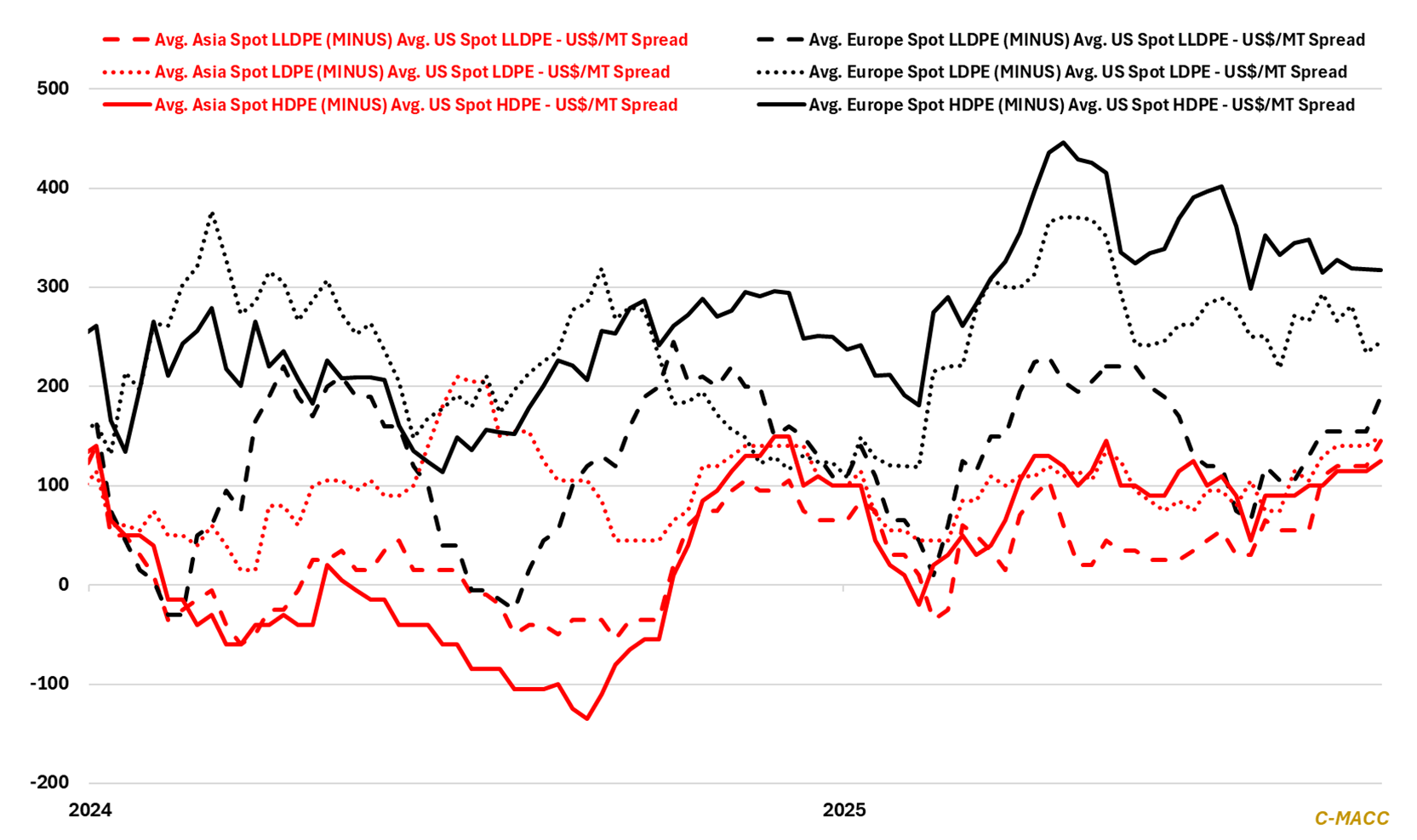 - Polyethylene (PE): Global PE benchmarks reset at unsustainably low levels as oversupply collides with muted demand, forcing inevitable rationalization and exposing the structural vulnerability of naphtha-based producers.