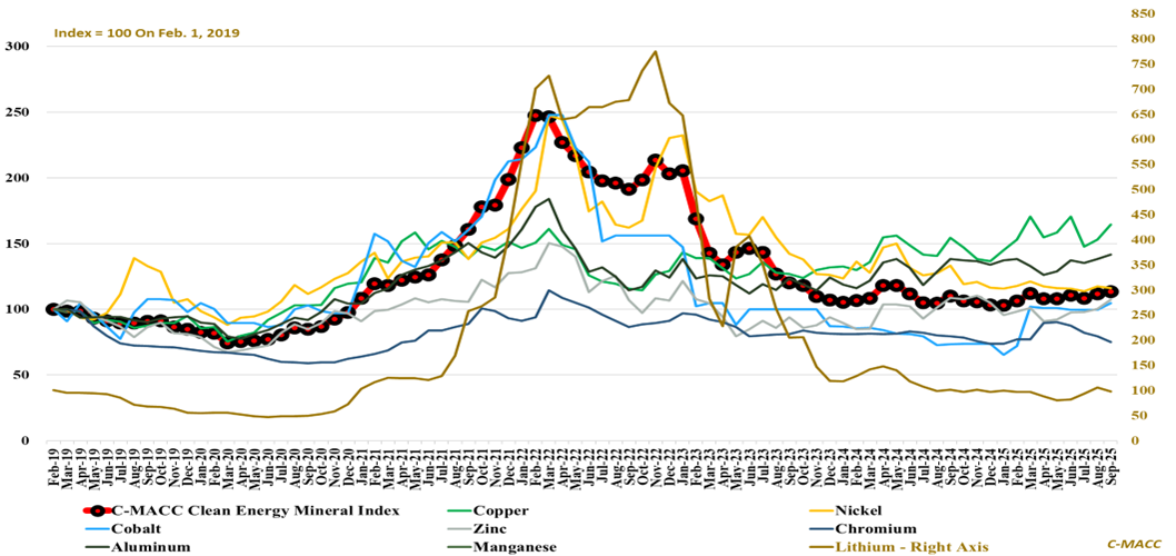 Exhibit 1: C-MACC clean energy mineral index rises 2% MoM, up 10% in 2025; copper outperforms lithium YTD.