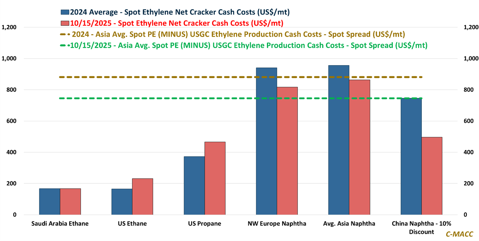 • Other Sector Developments: Feedstock spreads remain narrow globally, with declines seen last week across most feedstocks and monomers, suggesting downward upstream cost pressure on polymer prices in early 4Q25.