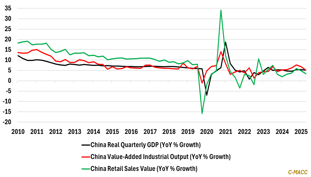 Exhibit 1: China’s deceleration exports volatility: retail, industry, and GDP converge toward structurally lower growth.