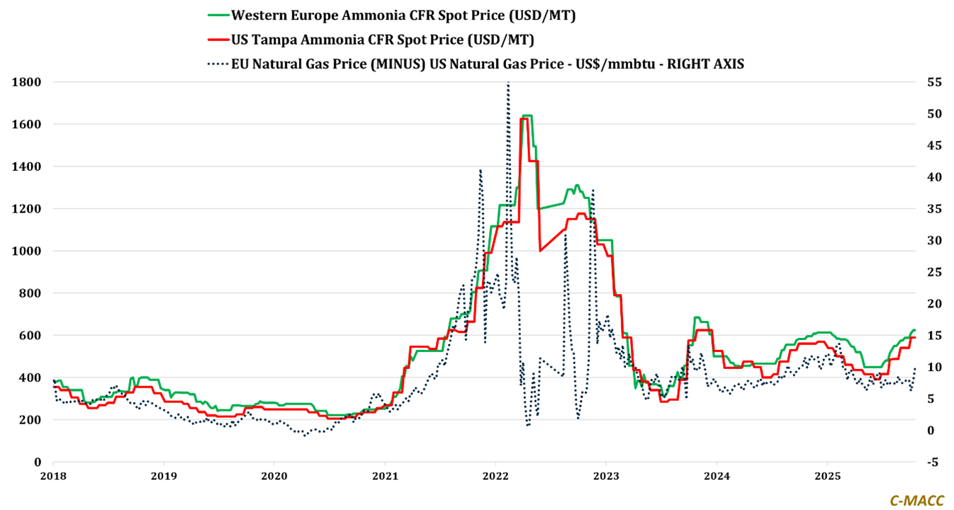 Exhibit 1 – Chart of the Day: Western ammonia spot prices hold 2025 highs; regional natural gas spreads tighter YTD.