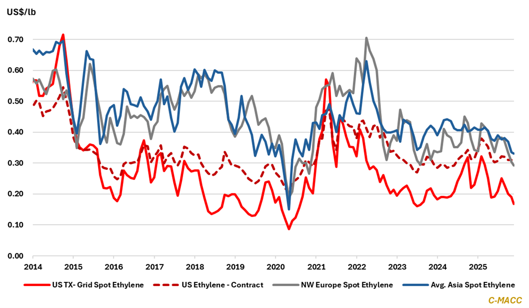 - General Thoughts: Exporting the advantaged US ethane cost position and surplus ethylene amid low oil prices and downstream market oversupply will likely be a bumpy ride into 2026, despite ongoing global restructuring.