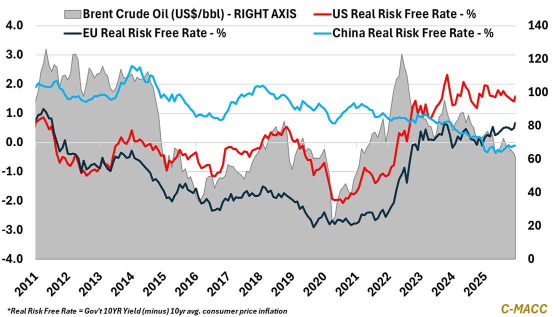 Exhibit 1: Real rates strengthen globally in late 2025 as Brent crude oil softens, tightening capital markets and returns.