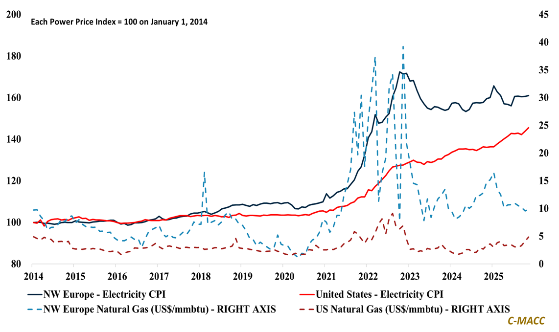 Exhibit 1: US power inflation re-accelerates versus Europe, keeping domestic industrial electricity risk elevated.