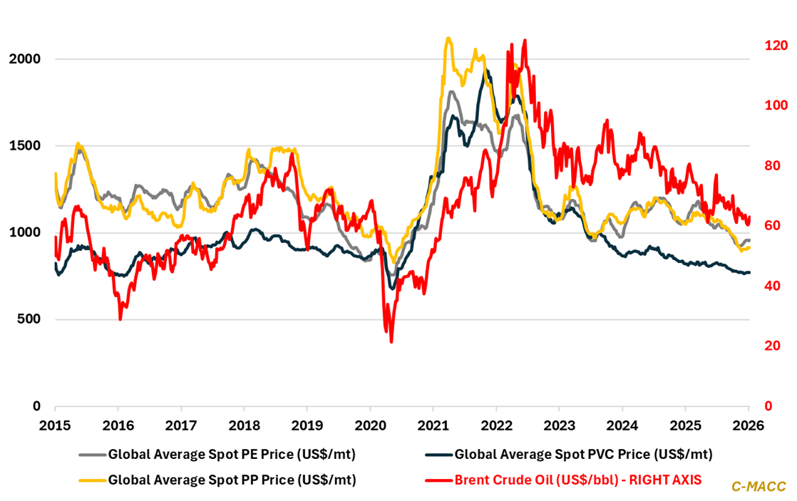Exhibit 1 – Chart of the Day: Global polymer spot prices stabilize in early 2026, as oil support steepens cost curves.