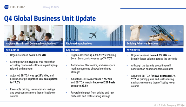 Exhibit 1: HB Fuller 4Q25 segment results show input-cost-led margin gains with likely limited 2026 repeatability.