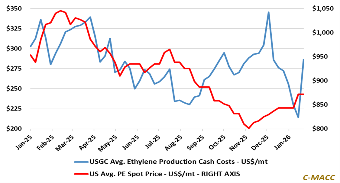 Exhibit 1 – Chart of the Day: Ethylene cash-cost volatility persisted in 2025 as PE prices masked margin stress.