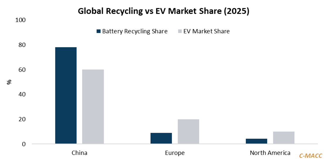 Exhibit 1: China’s recycling share exceeds its EV share, signaling manufacturing-led material loop dominance.