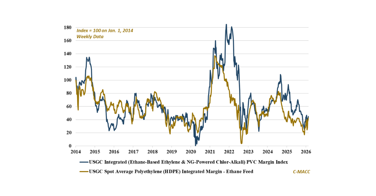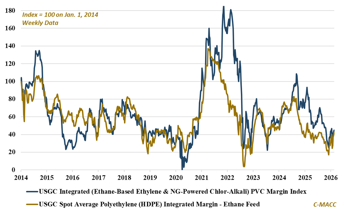 Exhibit 1 – Chart of the Day: US integrated PVC and PE margins rebound in 1Q26 as global cost dispersion widens.