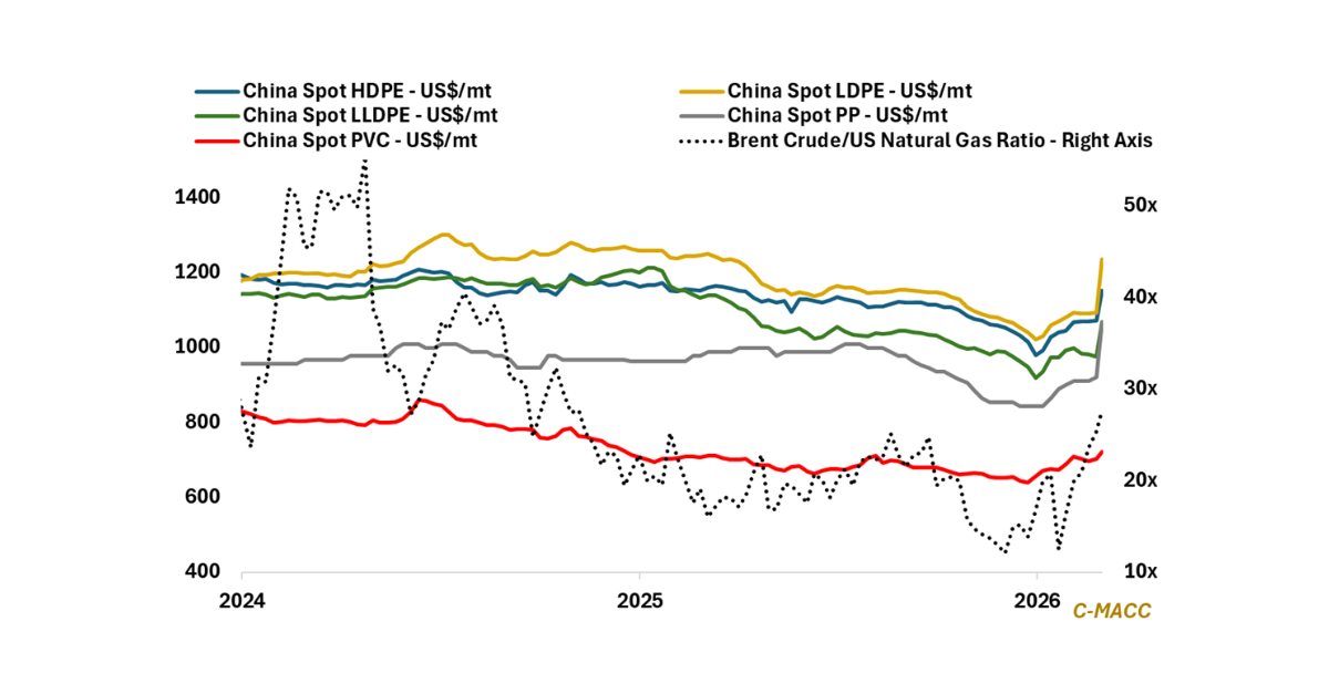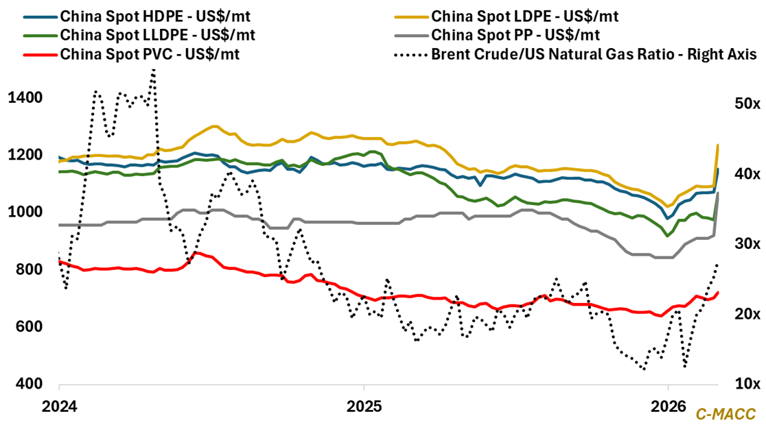 - Polyethylene (PE): Rising naphtha costs and Hormuz logistics risks are steepening the global PE cost curve, accelerating pressure on high-cost assets and strengthening the strategic position of low-cost integrated exporters.