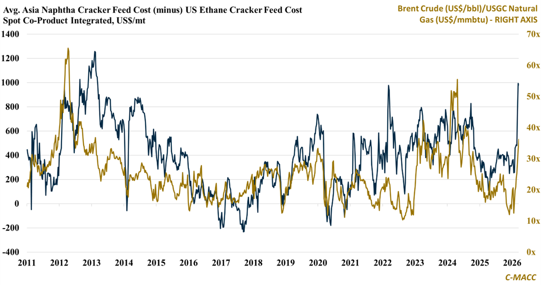 Exhibit 1 – Chart of the Day: Asian naphtha cracker margins collapse as the US ethane advantage widens structurally.