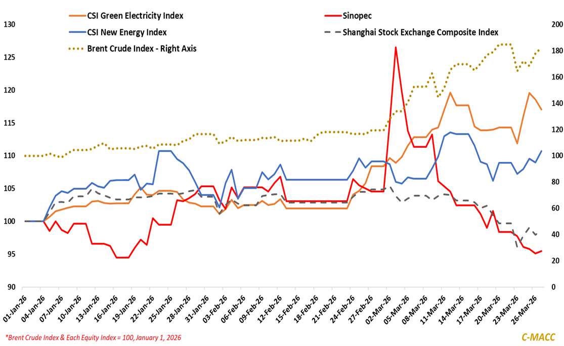 Exhibit 1: China transition equities outperform as Sinopec and the Shanghai Composite lag amid rising oil prices.