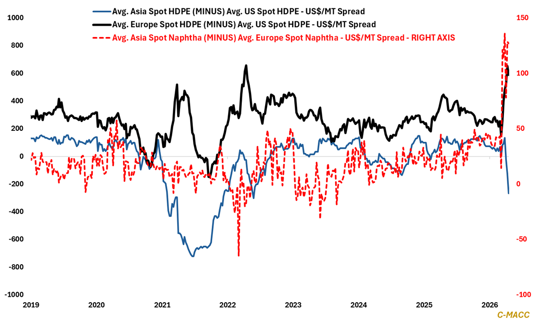 Exhibit 1: Feedstock stress, production adjustments, and inventory gaps drive divergent PE and naphtha spreads.