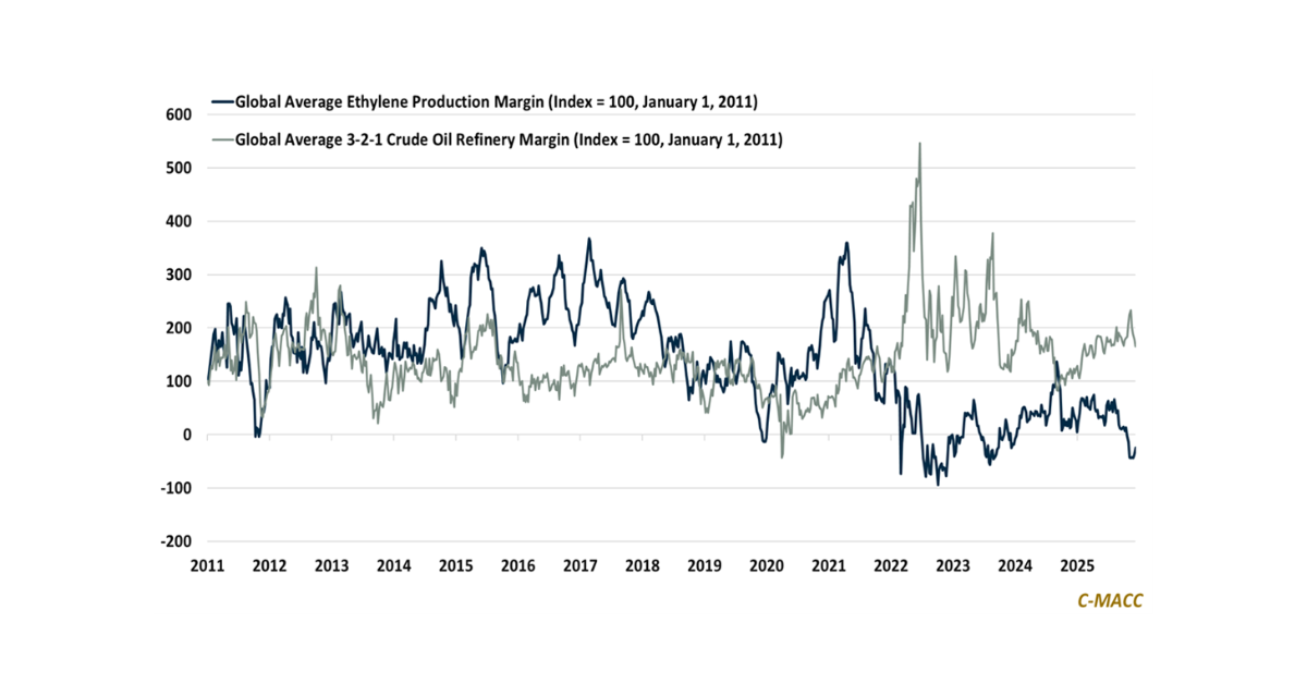 General Thoughts: Global average ethylene production margins collapsed in early 4Q25 then stabilized modestly, but only restructuring like high-cost cracker closures can loosely replicate refining’s