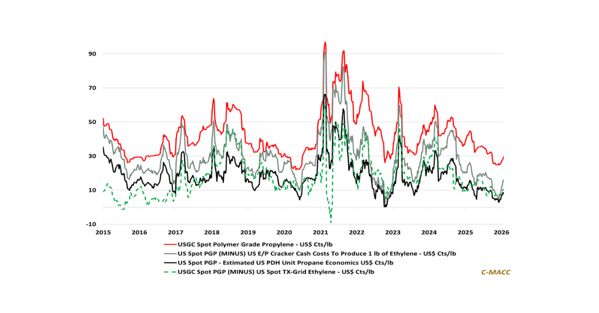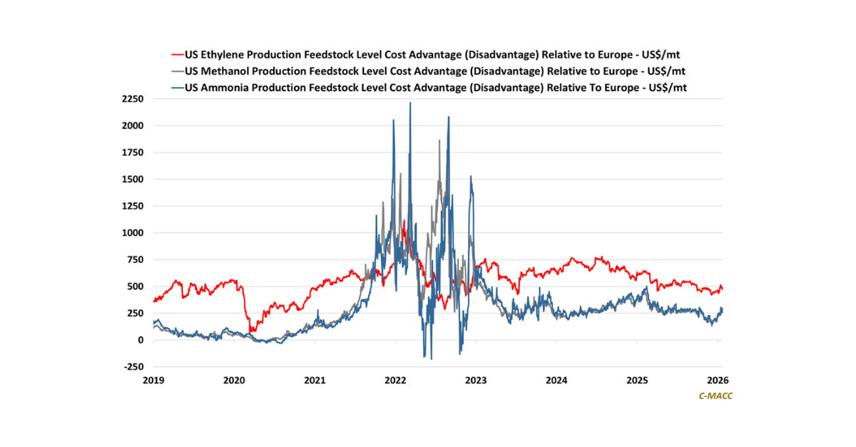 General Thoughts: Weather-driven global natural gas inflation supports higher chemical prices despite relative cost positions holding, with chemical margins compressing absent structural supply cuts.