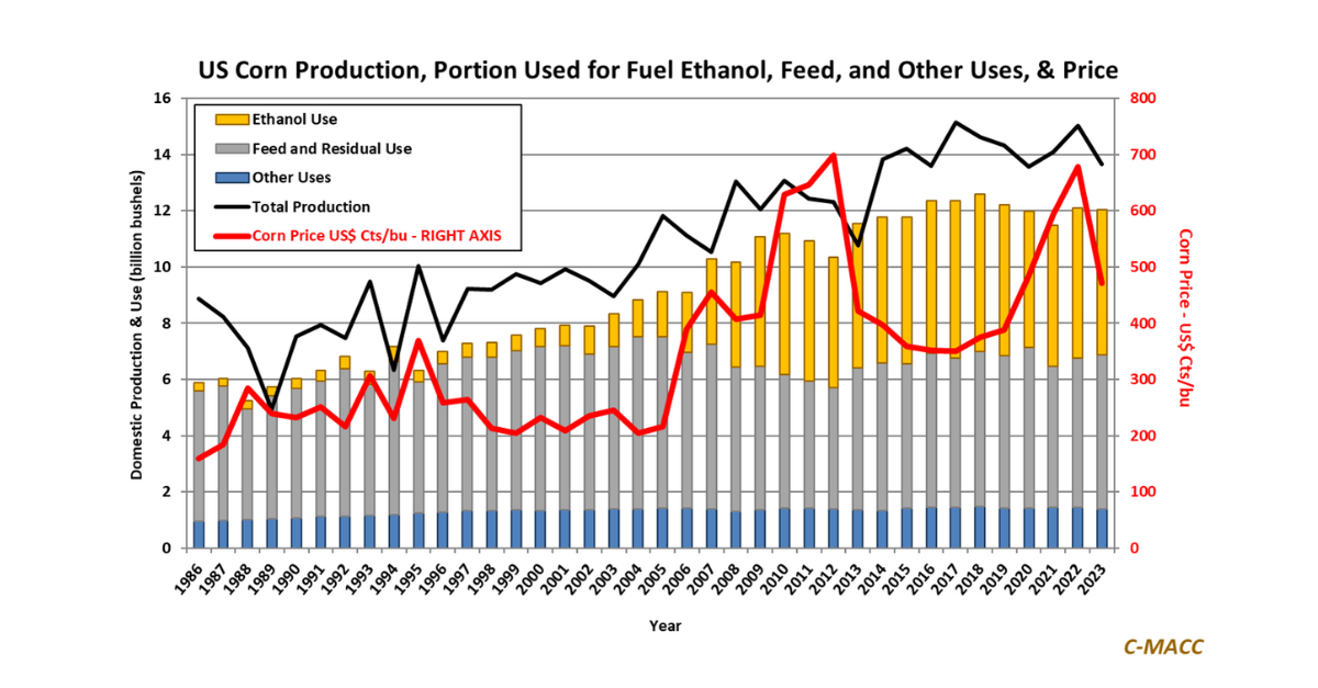 General Thoughts: US corn production has been rangebound during the past ~10 years, suggesting that absent a supply boost this decade rising bioproduct demand will