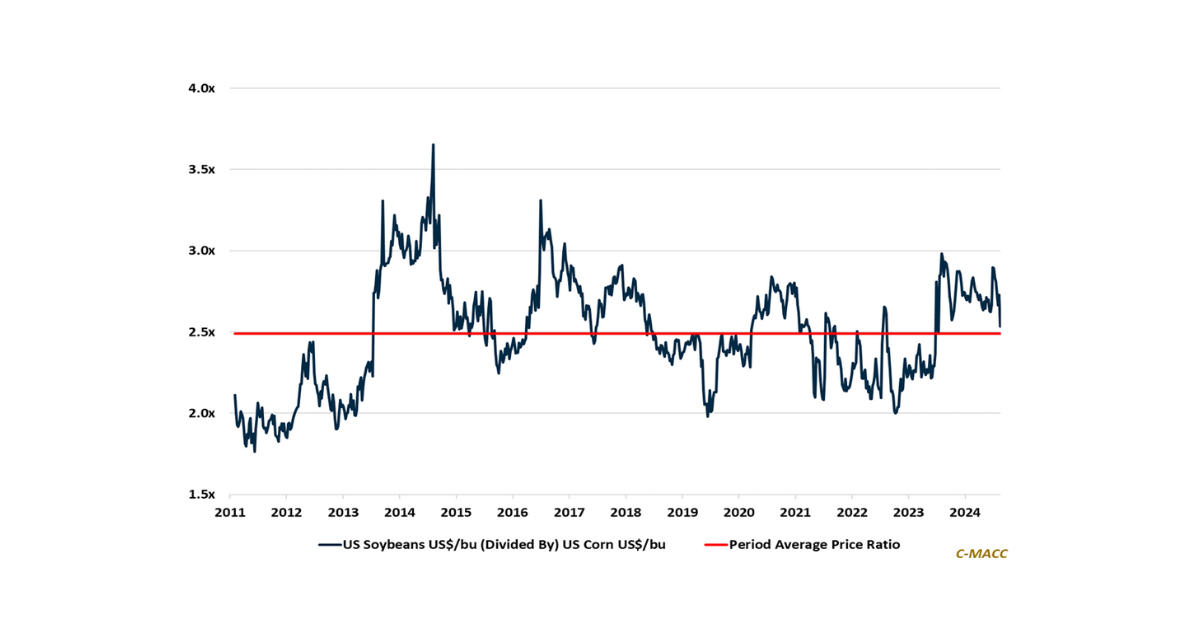 General Thoughts: US corn and soybean prices have fallen to YTD lows in August, but soybean values have fallen relative to corn, potentially putting in