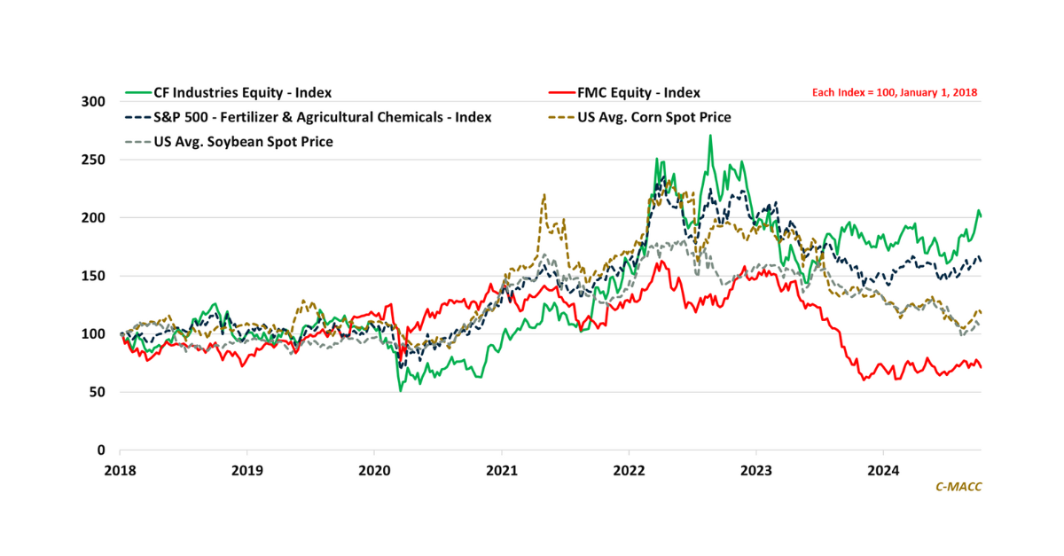 General Thoughts: The S&P 500 Fertilizer & Agricultural Chemical equity index has underperformed in 2024, but several factors have partly offset crop market weakness to