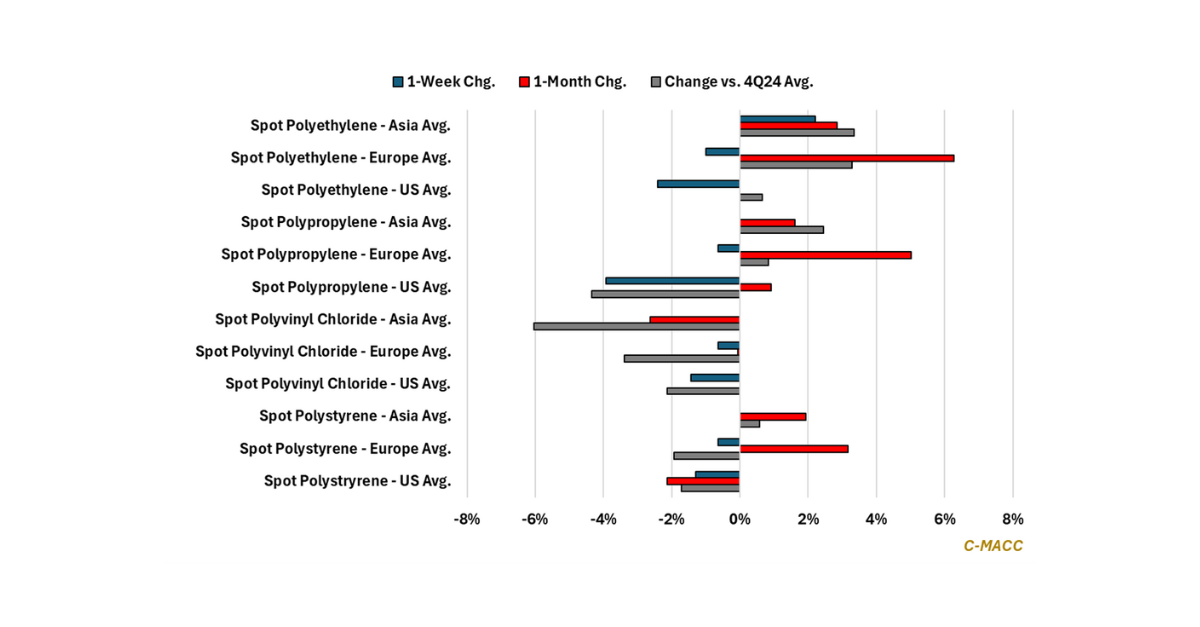 General Thoughts: Global spot polymer prices were, on average, lower WoW, with US and European prices falling relative to Asia – crude oil price weakness