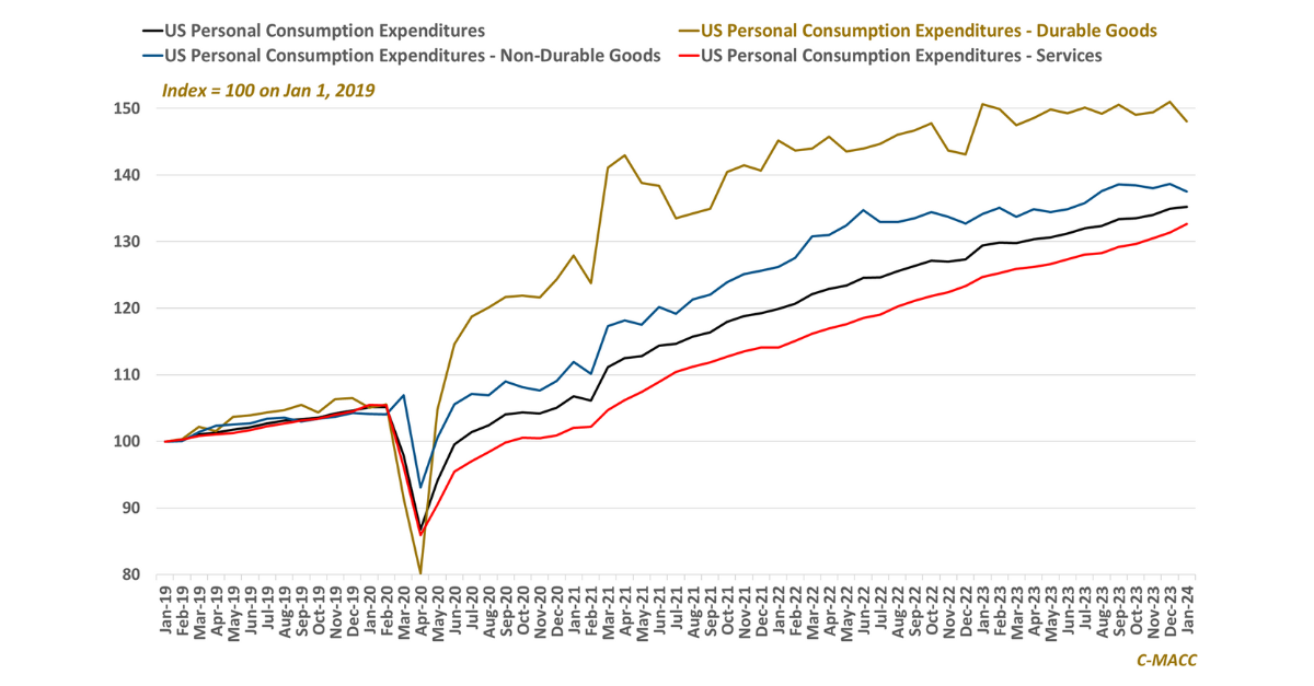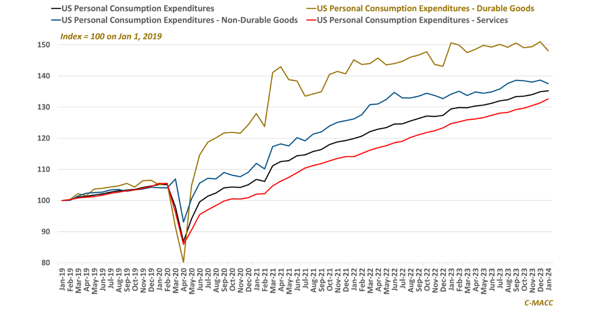 General Thoughts: US personal consumption expenditures for durable and non-durable goods declined in January, while YTD domestic chemical production, on average, is higher, indicating that