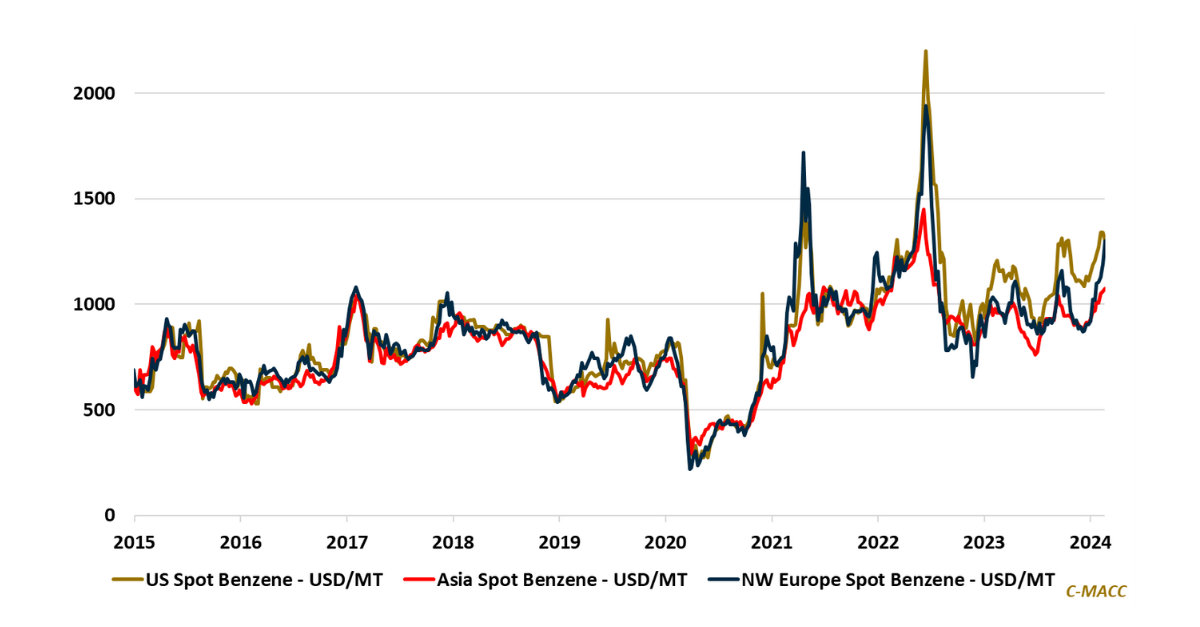 General Thoughts: Western spot propylene and benzene prices have risen to a sizable premium relative to Asia YTD – a plus for Western manufacturers and