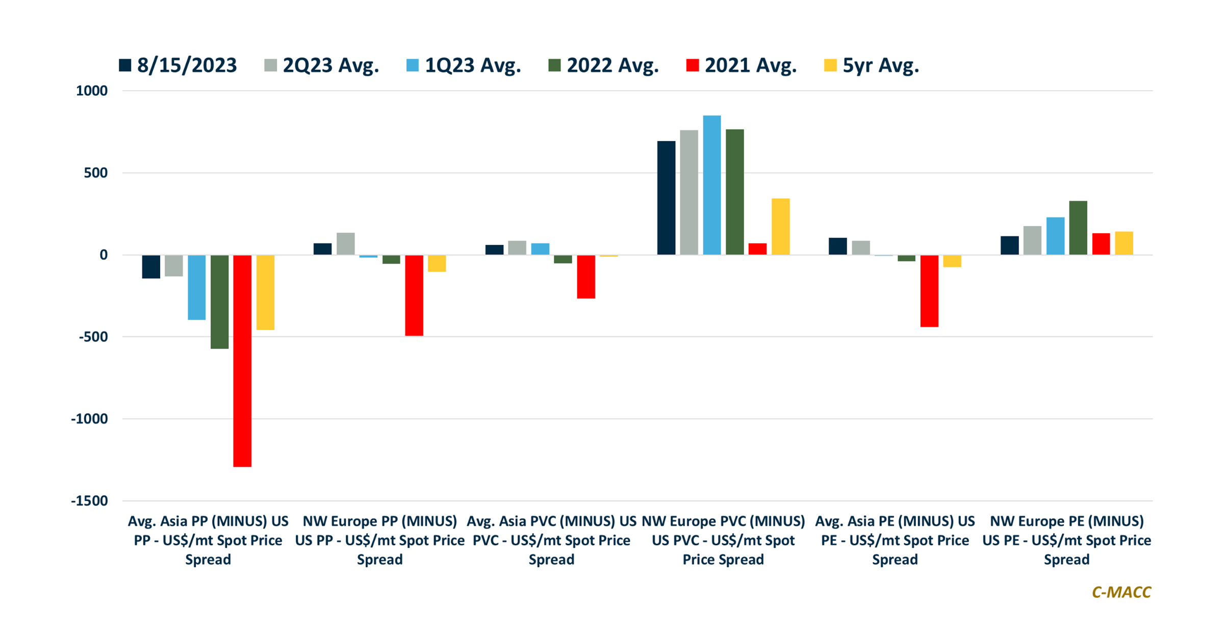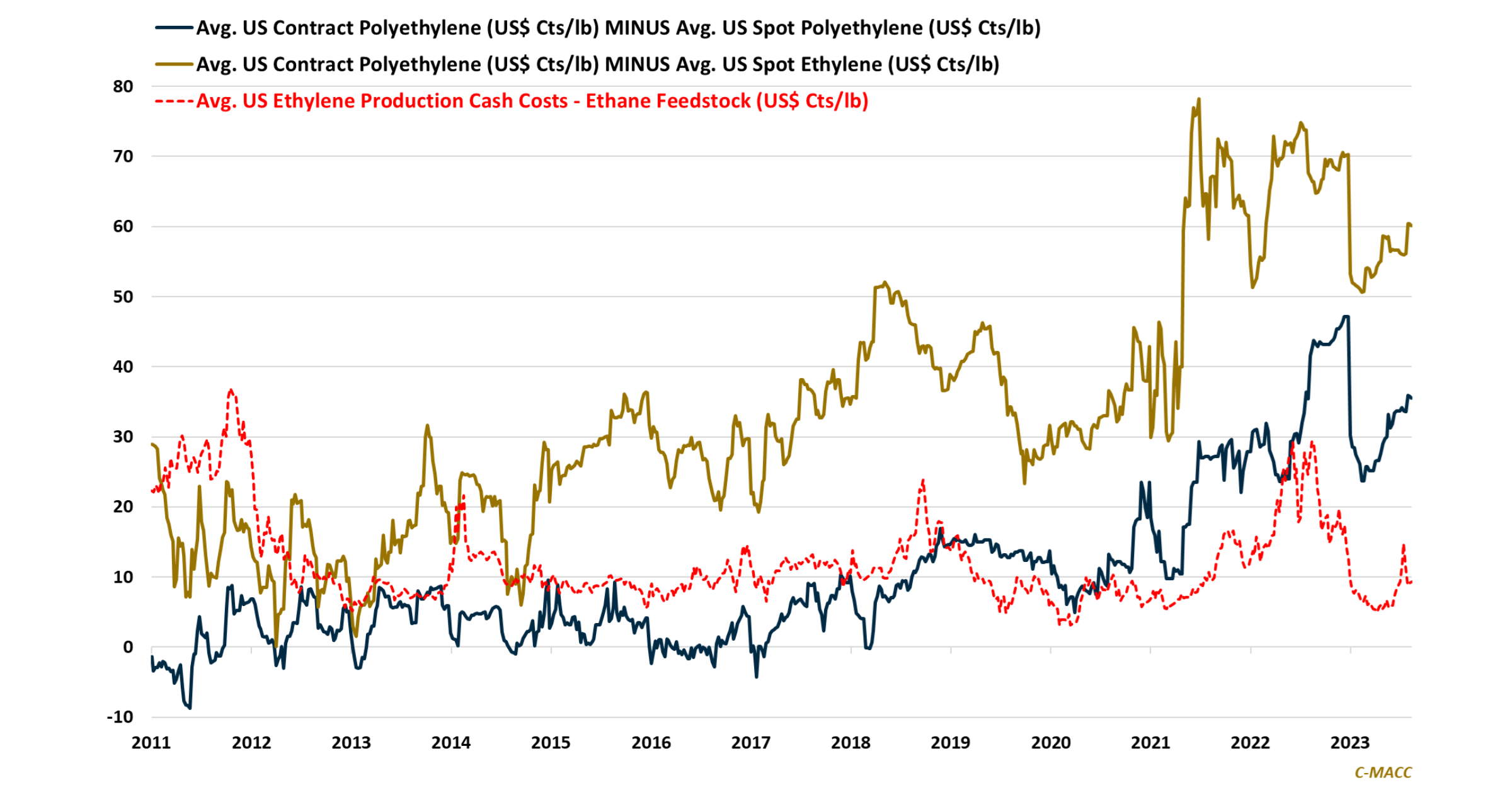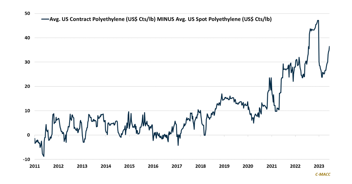 US polyethylene contract prices show an upward trend relative to spot values as exports have risen compared to domestic demand, becoming less linked to the