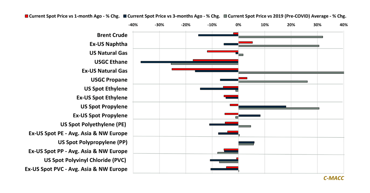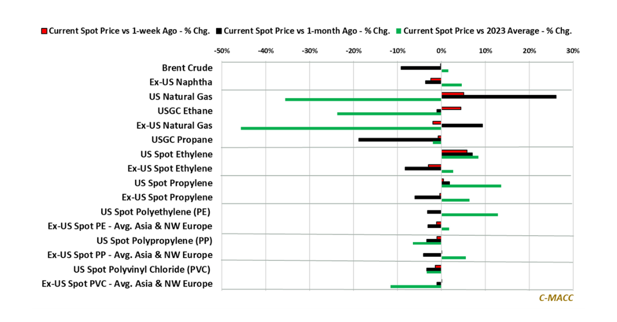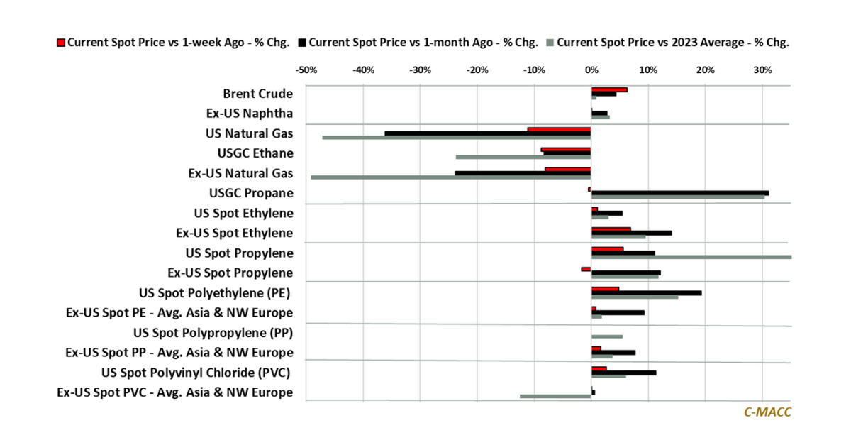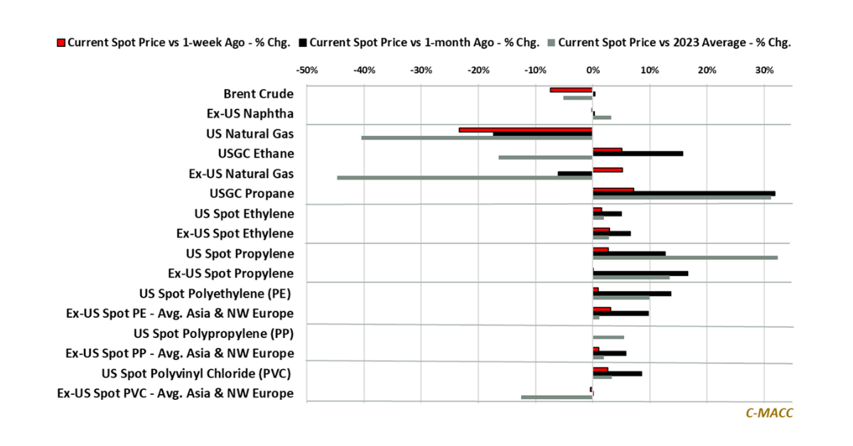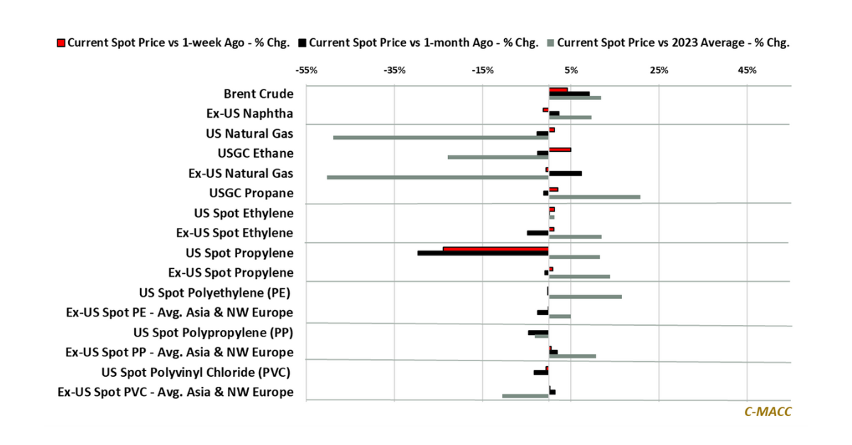Polymer Market Trends: Global spot polymer prices reflected less weakness than upstream chemical values, and most Ex-US feedstock costs WoW, which increases the likelihood of