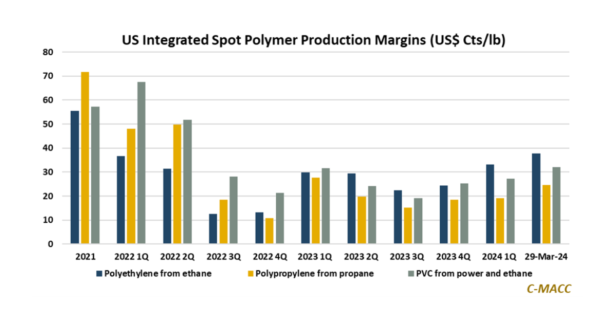 Polymer Market Trends: US integrated spot polymer margins leaped higher in 1Q24 compared to 2H23 levels and closed the quarter above their 1Q average despite