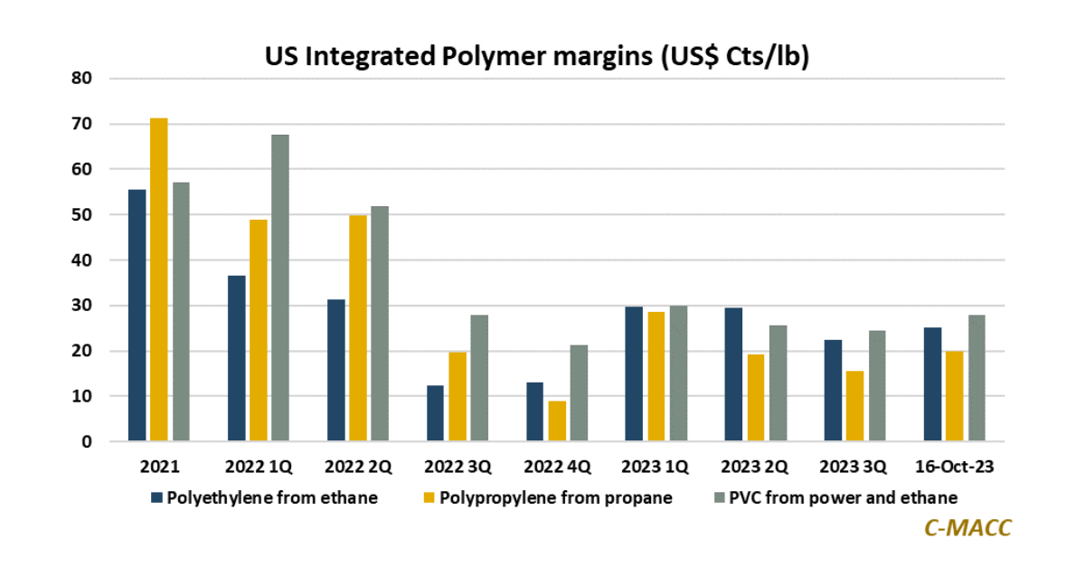 US integrated polymer margins have risen QTD in 4Q23 to a higher level than their 3Q23 and 4Q22 average, likely spurring positive domestic producer views