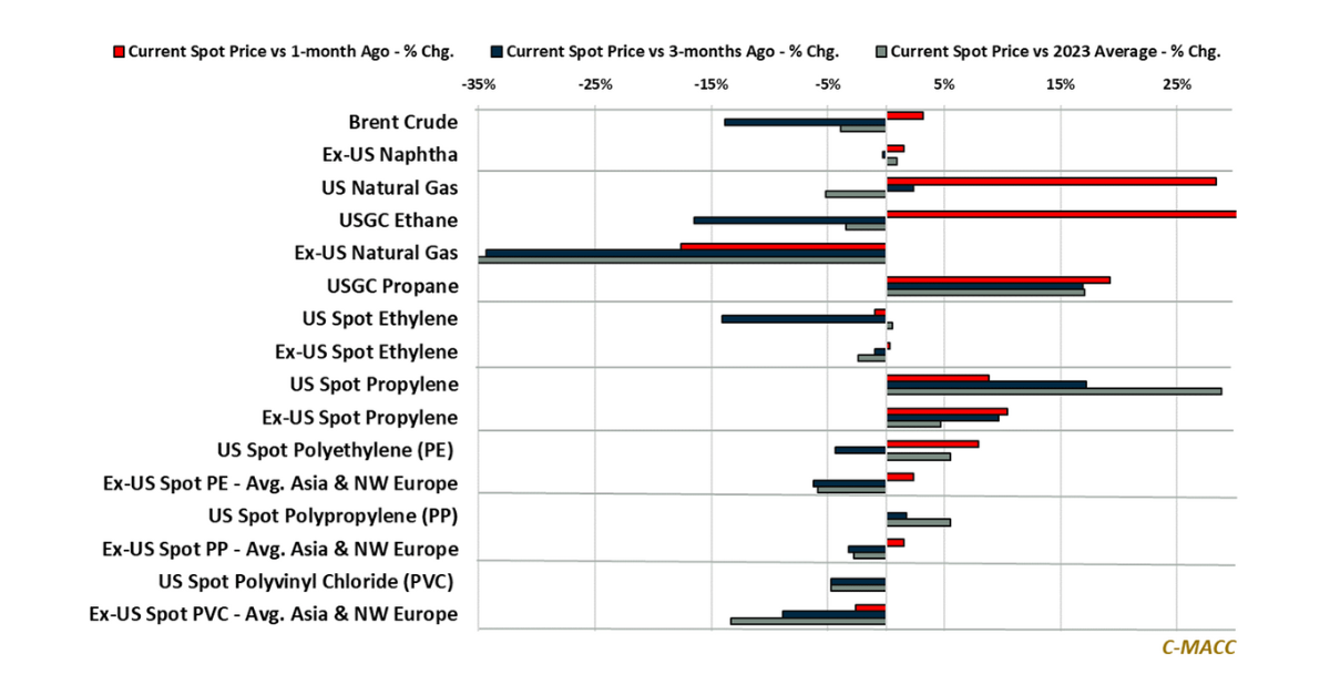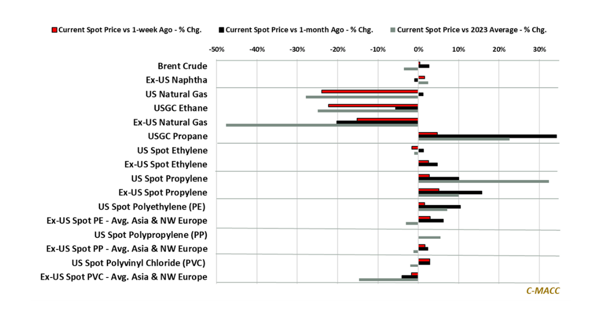 Feedstock Market Trends: Brent Crude and ex-US naphtha values reflected more support WoW than global natural gas and US ethane – North American costs, on