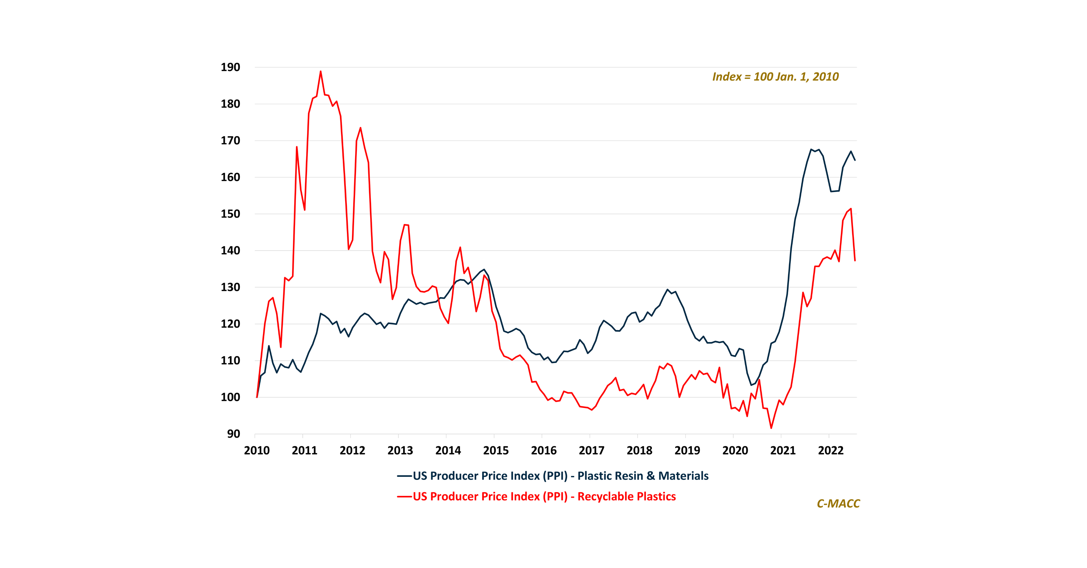 The price of plastic resin & materials and recycled plastics declined in July, and the value slide worsened in August. Recycled resin prices will likely