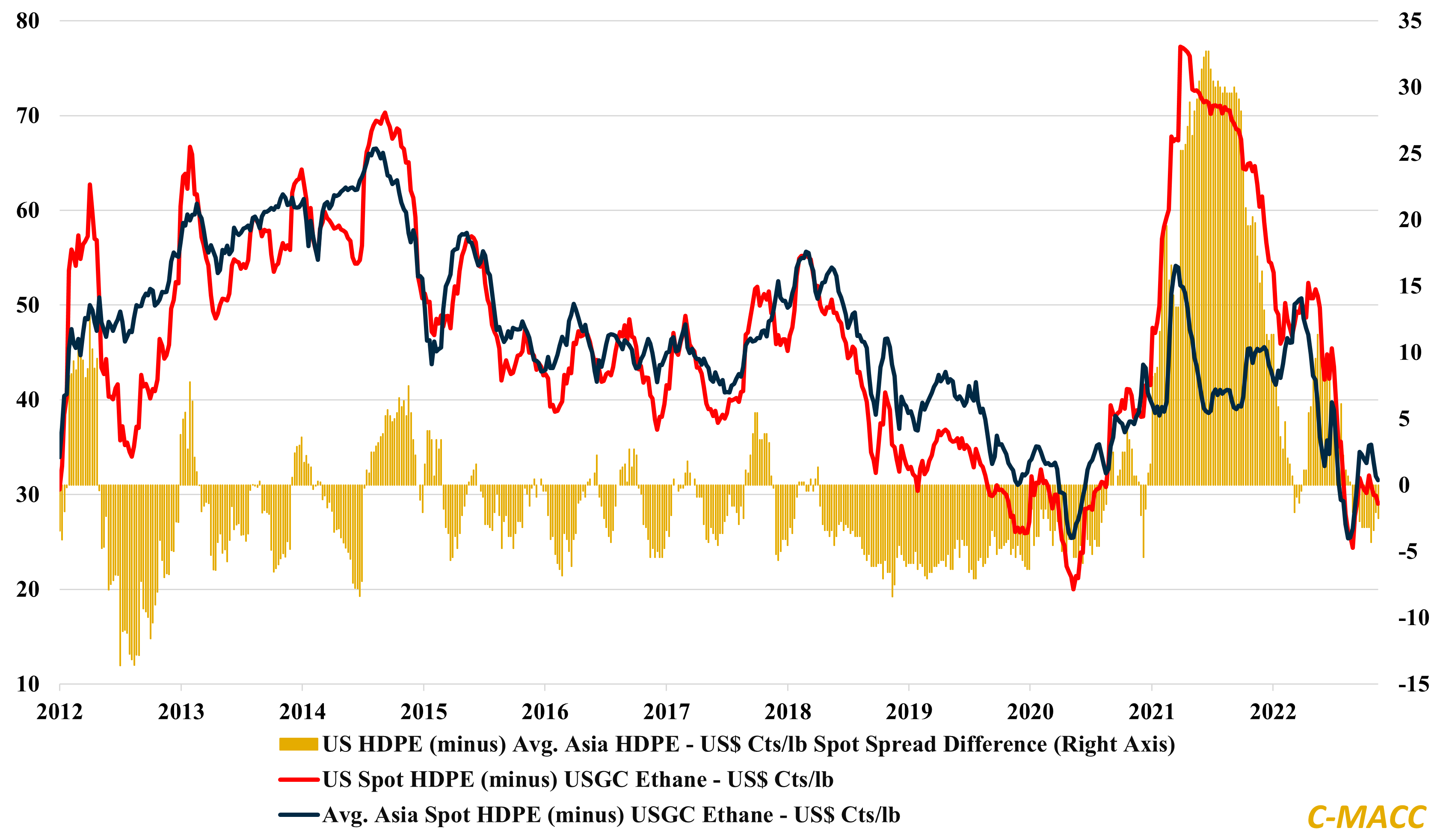 North American chemical producers have a sizable cost advantage relative to Europe and Asia – the benefits of those competing more with ex-US natural gas