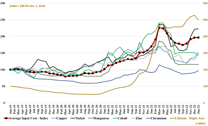The C-MACC Clean Energy Minerals Monthly Price Index was unchanged MoM in January, and we anticipate continued support in 1H23, though some materials will stay
