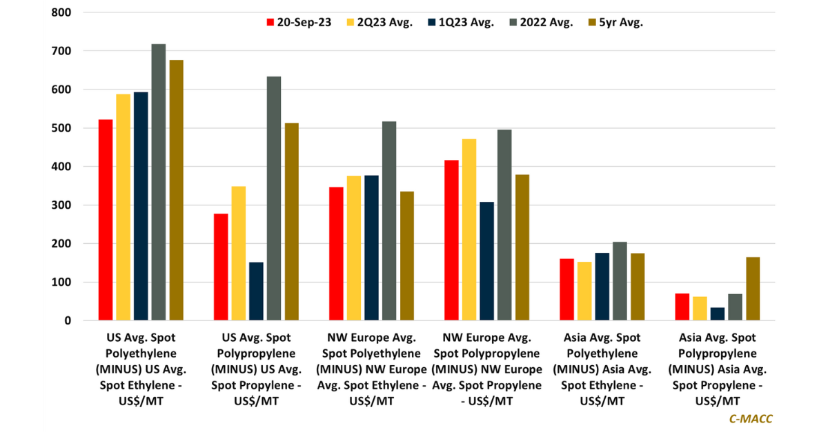 Global base chemical values have increased with crude-oil-based feedstocks in 3Q23. However, polymer values have risen more relative to monomer values in Asia than in