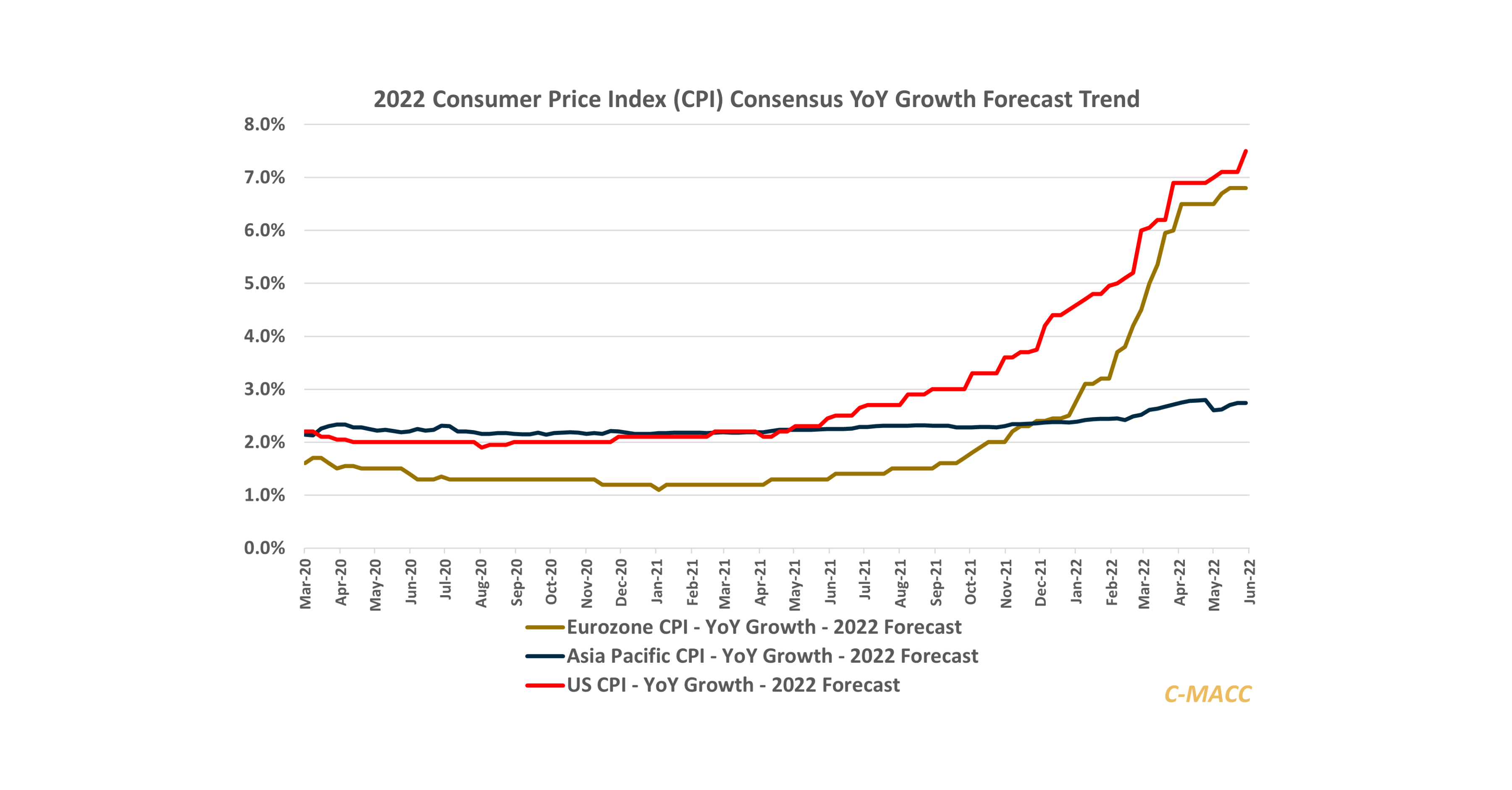 Western market consumer price inflation expectations for full-year 2022 have surged YTD to show considerably more inflation relative to Asia. We discuss the latest US