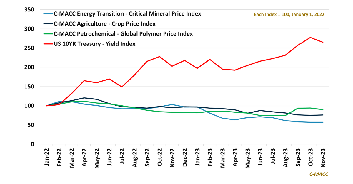 Global polymer, critical mineral, and crop prices have fallen from 2022 highs while financing costs and demand uncertainties have risen – a negative trend for