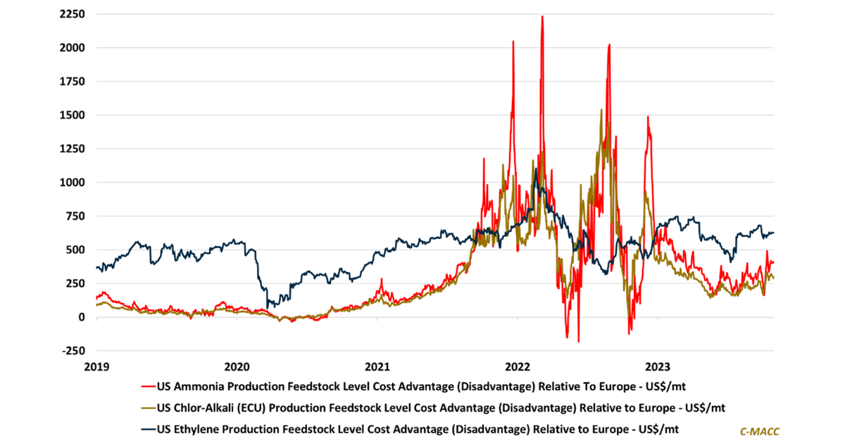 The significant chemical production cost differences between Europe and North America are present in producer 2H23 updates – we highlight Ammonia and Chlor-Vinyls as prime